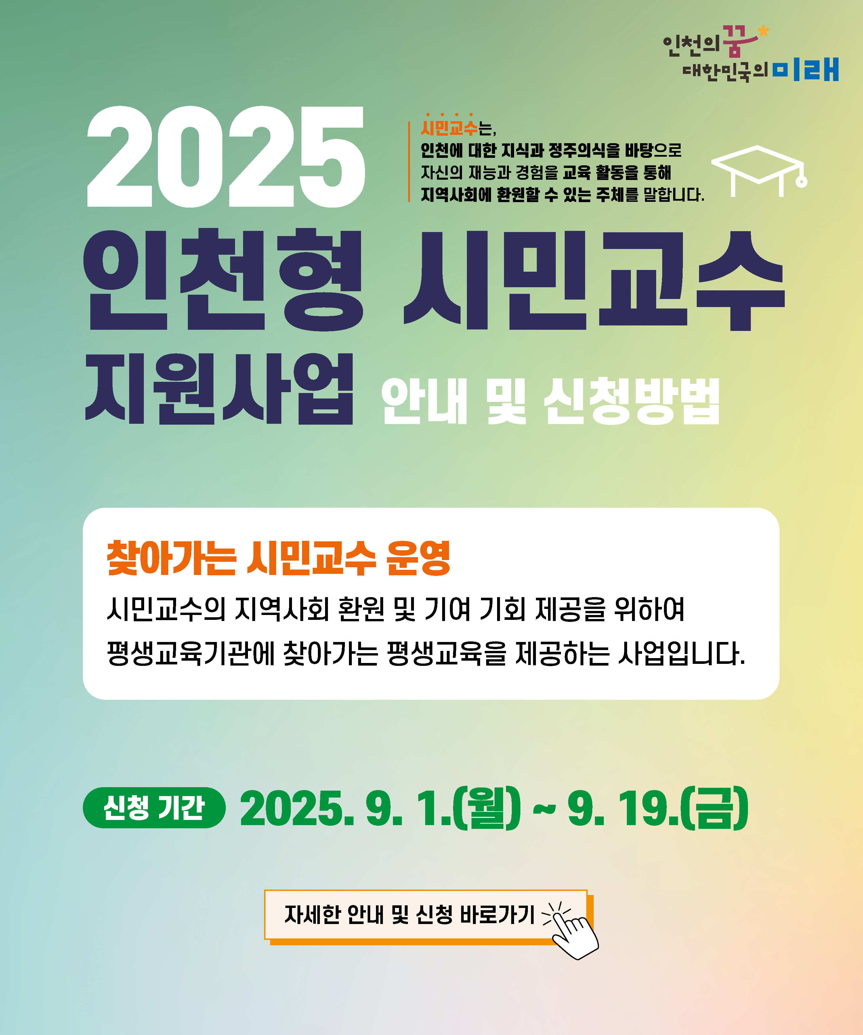 ์ ๋ฌธ ์ง์์ ๊ฐ์ง ์ธ์ฒํ ์๋ฏผ๊ต์๋ฅผ ์ง์ญ ํ์ฅ์ผ๋ก ์ง์ ํ๊ฒฌํ์ฌ ๋ค์ํ ๋ถ์ผ์ ๋ง์ถคํ ๊ต์ก์ ์ง์ํ๊ณ ์ ํ์ค๋, ๊ด์ฌ ์๋ ๊ธฐ๊ด๋ค์ ๋ง์ ์ ์ฒญ ๋ฐ๋๋๋ค.