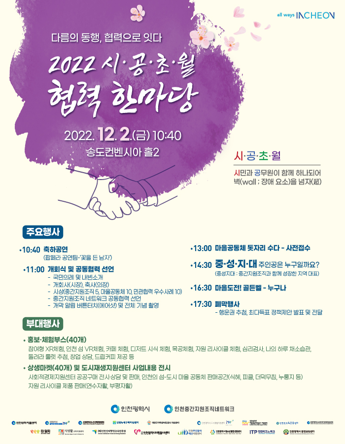 - 홍보 및 체험부스(40개) : 참여형 XR체험, 인천 섬 VR체험, 카페체험(디저트 시식),