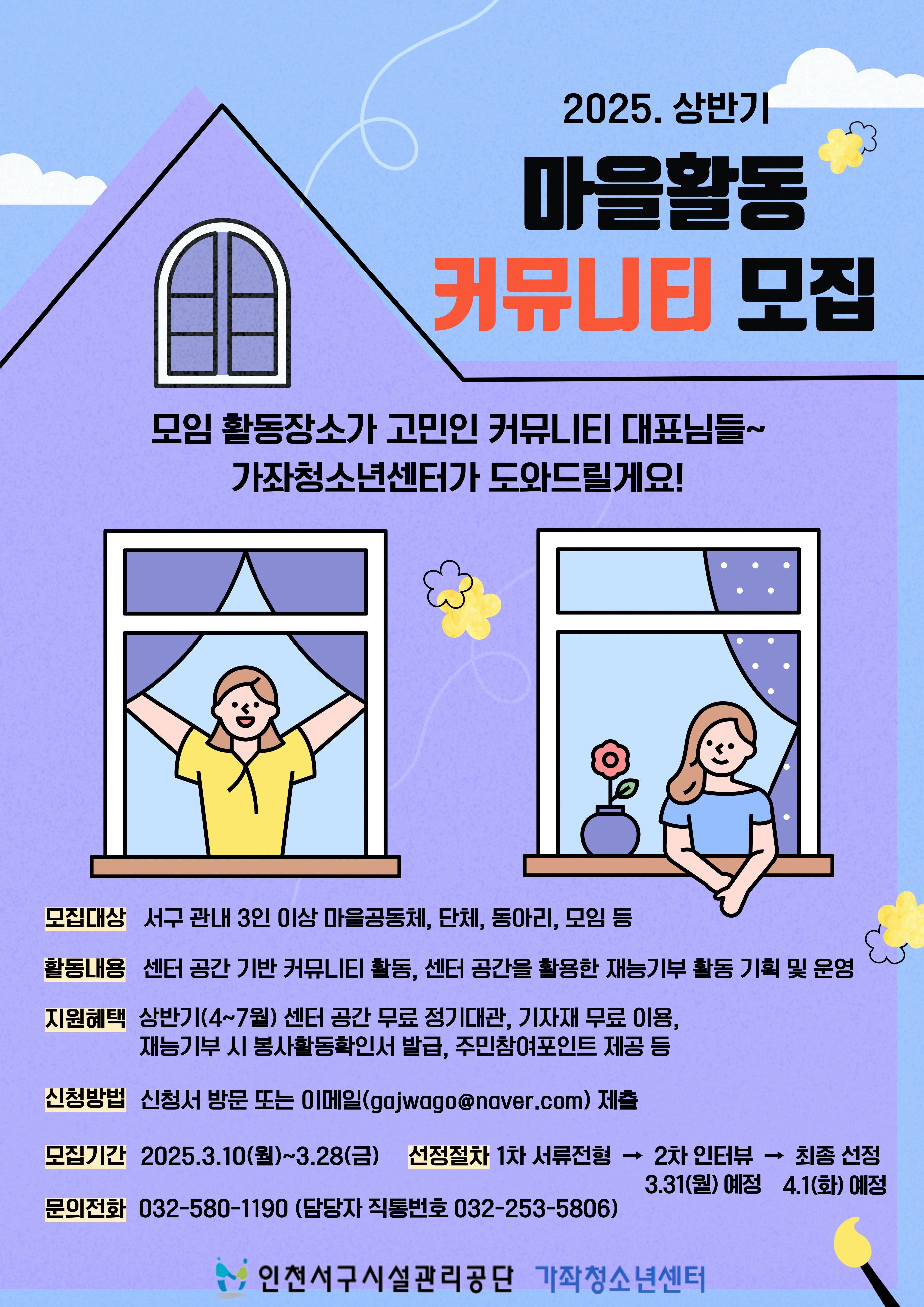 가좌청소년센터에서는 지역주민의 커뮤니티 활동을 지원하기 위하여 아래와 같이 상반기 커뮤니티를 모집하오니 많은 관심과 참여 부탁드립니다.