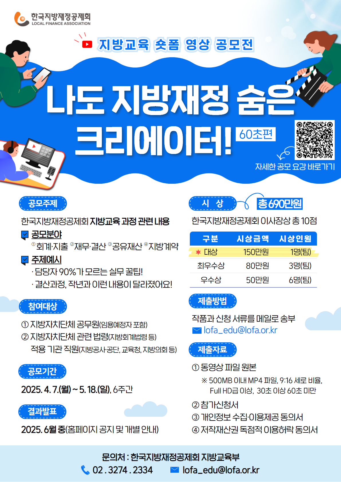 한국지방재정공제회에서는 지방교육 분야에 대한 흥미 유발 및 실무 능력과 콘텐츠 제작 능력을 겸비한 강사 후보군 발굴 등을 위해 「나도 지방재정 숨은 크리에이터」 공모전을 개최합니다