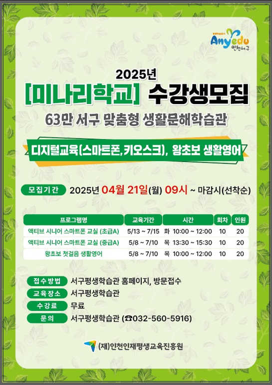 인천 서구에서는 63만을 넘어 지속적으로 증가하는 지역인구(중·장·노년층)에 따른 세대 간 디지털 양극화 해소와 원활한 일상생활 지원을 위한 생활문해학습관 『미나리 학교』를 운영하고 있습니다.