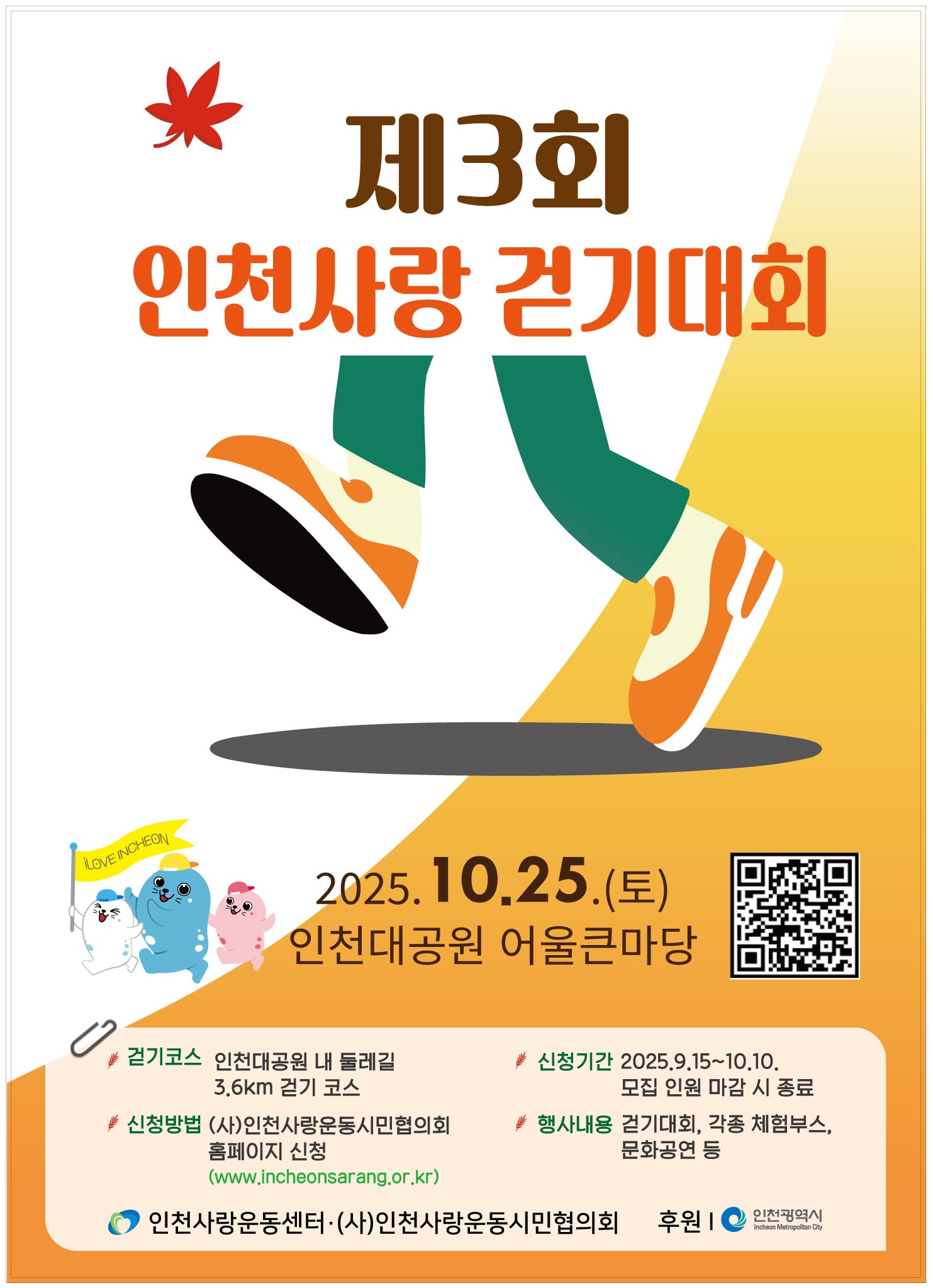 함께 걷기를 통해 시민의 건강을 증진하고, 인천사랑운동 홍보를 통해 ‘인천사랑’ 공감대 형성과 실천 계기를 마련하고자 개최하는 제3회 인천사랑 걷기대회를 안내하오니 많은 관심 바랍니다.