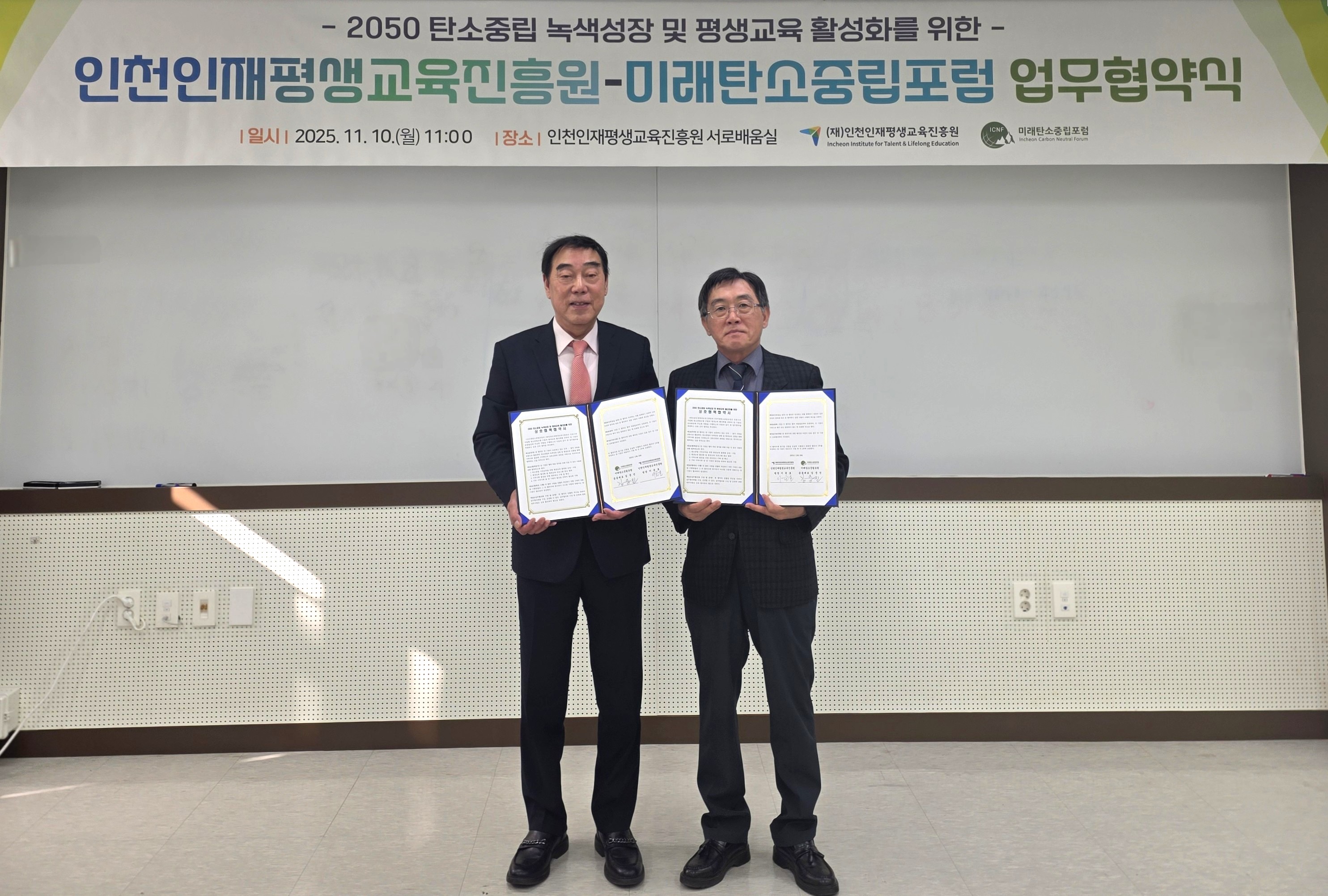 포토갤러리 Home 정보마당 포토갤러리 상세 - 번호, 제목, 작성자, 파일, 조회수, 작성일 정보 제공 제목 인천인재평생교육진흥원-미래탄소중립포럼 업무협약식(MOU) 개최 작성자 평생교육부 등록일 2025-11-10 조회 39 < 인천인재평생교육진흥원-미래탄소중립포럼 업무협약식(MOU) 개최 > ❍ 일 시: 2025. 11.10.(월) 11:00 ❍ 장 소: 인천인재평생교육진흥원 서로배움실 ❍ 참 석: 이윤호 인천인재평생교육진흥원장, 김중진 미래탄소중립포럼 공동대표 등 관계자 8명 ❍ 협약내용: 2050 탄소중립 녹색성장 및 평생교육 활성화를 위한 지원사업 이전글 2025 인천 디지털 건강문해 (11.4~11.5) 다음글 2025년 인천광역시 성인문해교육 시화전 개최 목록