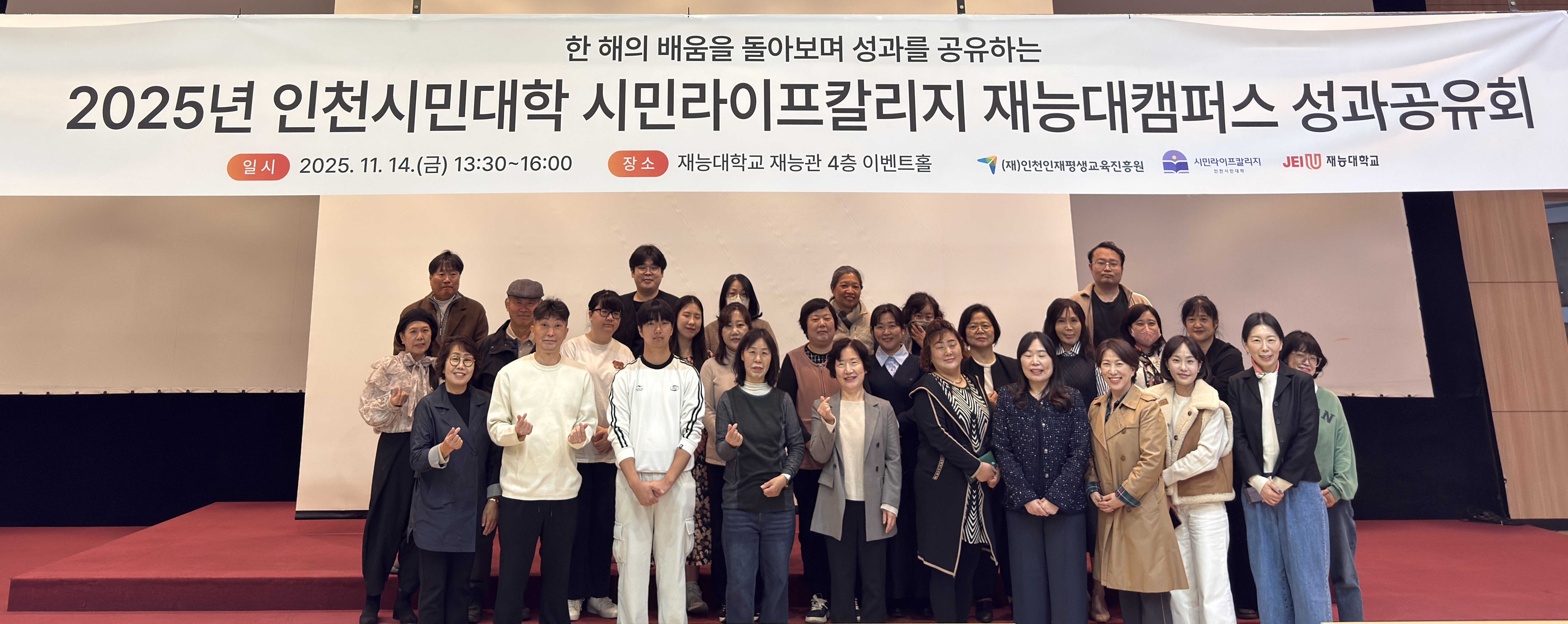포토갤러리 Home 정보마당 포토갤러리 상세 - 번호, 제목, 작성자, 파일, 조회수, 작성일 정보 제공 제목 2025년 인천시민대학 시민라이프칼리지 재능대캠퍼스 성과공유회(종강식) 개최 작성자 시민대학부 등록일 2025-11-14 조회 195 2025년 인천시민대학 시민라이프칼리지 재능대캠퍼스 성과공유회(종강식) 개최 ○ 일시 및 장소: 2025. 11. 14.(금) 13:30 / 재능대학교 재능관 4층 세미나실 ○ 참석자: 최소례 재능대학교 평생교육원장, 재능대학교 교수자 및 관계자, 담당자 등 ○ 내용: 2025년 재능대캠퍼스 교육과정 및 성과 공유, 우수학습자 수상 및 소감, 일일 특강 등 이전글 2025년 인천시민대학 시민라이프칼리지 인천대캠퍼스 시민예술제 다음글 2025년 인천시민대학 시민라이프칼리지 한국조지메이슨대캠퍼스 수료식 및 추수감사 가족축제 목록