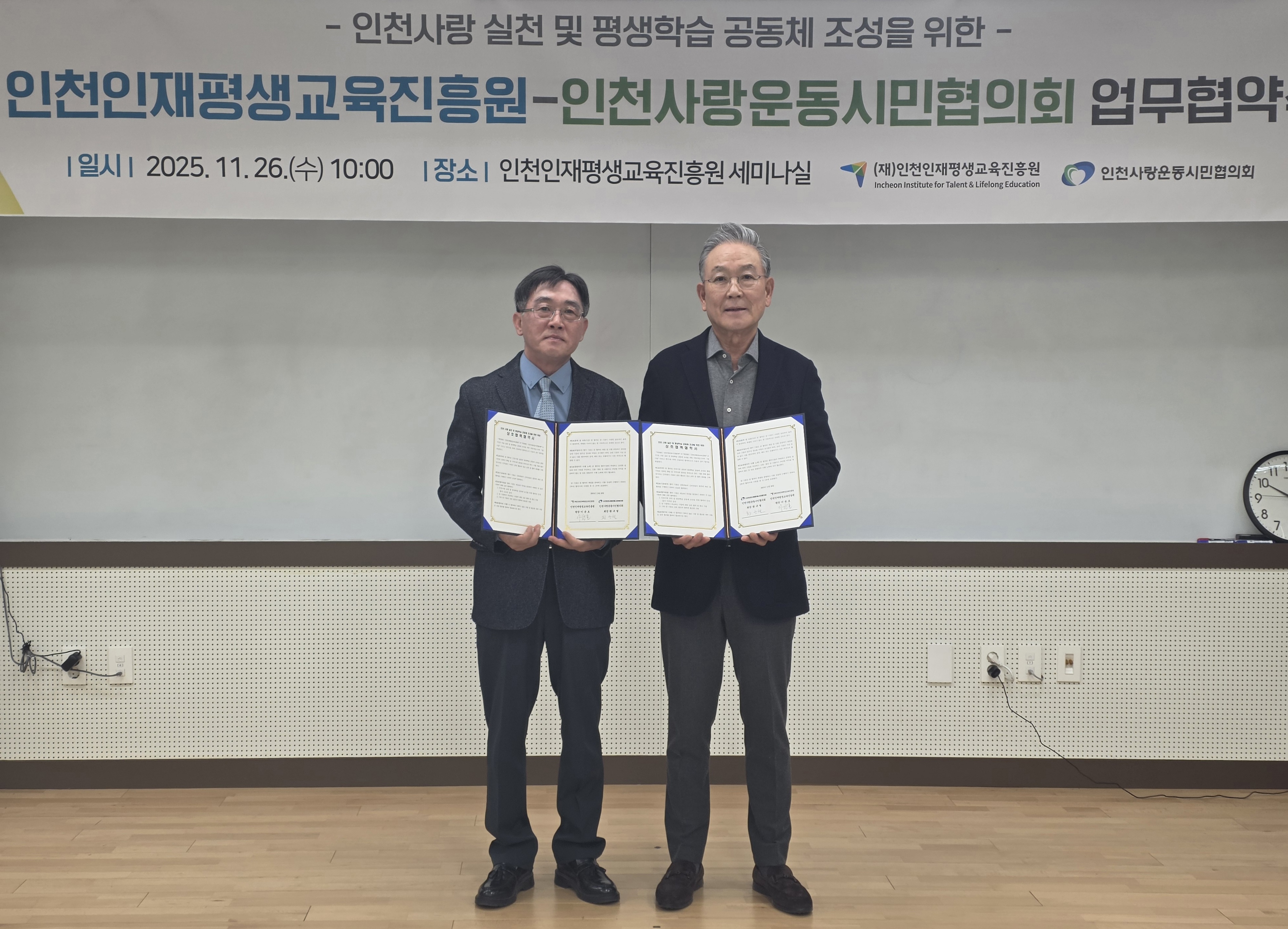 포토갤러리 Home 정보마당 포토갤러리 상세 - 번호, 제목, 작성자, 파일, 조회수, 작성일 정보 제공 제목 인천인재평생교육진흥원-인천사랑운동시민협의회 업무협약식(MOU) 개최 작성자 평생교육부 등록일 2025-11-26 조회 139 < 인천인재평생교육진흥원-인천사랑운동시민협의회 업무협약식(MOU) 개최 > ❍ 일 시: 2025. 11.26.(수) 10:00 ❍ 장 소: 인천인재평생교육진흥원 세미나실 ❍ 참 석: 이윤호 인천인재평생교육진흥원장, 황규철 인천사랑운동시민협의회장 등 관계자 8명 ❍ 협약내용: 인천사랑 실천 및 평생학습 공동체 조성을 위한 지원사업 이전글 2025년 인천시민대학 시민라이프칼리지 경인여대캠퍼스 성과공유회(종강식) 개최 다음글 2025년 인천시민대학 시민라이프칼리지 한국뉴욕주립대캠퍼스 종강식 목록