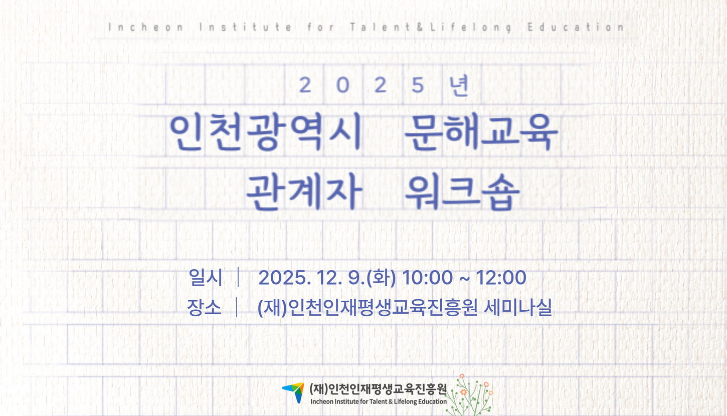 포토갤러리 Home 정보마당 포토갤러리 상세 - 번호, 제목, 작성자, 파일, 조회수, 작성일 정보 제공 제목 2025 인천광역시 문해교육 관계자 워크숍(결과보고회) 작성자 평생교육부 등록일 2025-12-10 조회 81 인천 관내 문해교육기관 관계자 및 실무자가 참석하여 2025년 문해교육 사업 성과를 공유하고, 지역 문해교육의 활성화와 향후 발전 방안을 모색하는 시간을 가졌습니다. ▶일시: 2025. 12. 9.(화) 10:00~12:00 ▶장소: 인천인재평생교육진흥원 세미나실 ▶주요내용 (특강) '인천, 시인과 만나다' (이병국 시인): 시를 통해 지역성과 예술성이 어우러진 문해교육의 방향을 모색 (성과공유) 디지털 건강문해(닌텐도 건강 놀이터)_인천인재평생교육진흥원 (성과공유) 생활문해(스마트폰, 시니어 AI 영상작가 등)_만수종합사회복지관 이전글 인천시민대학 지산학 네트워크 활성화 사업: 인천시민대학 시민라이프칼리지 실무협의회 다음글 2025년 하반기 인천 평생교육 운영위원회 개최 목록
