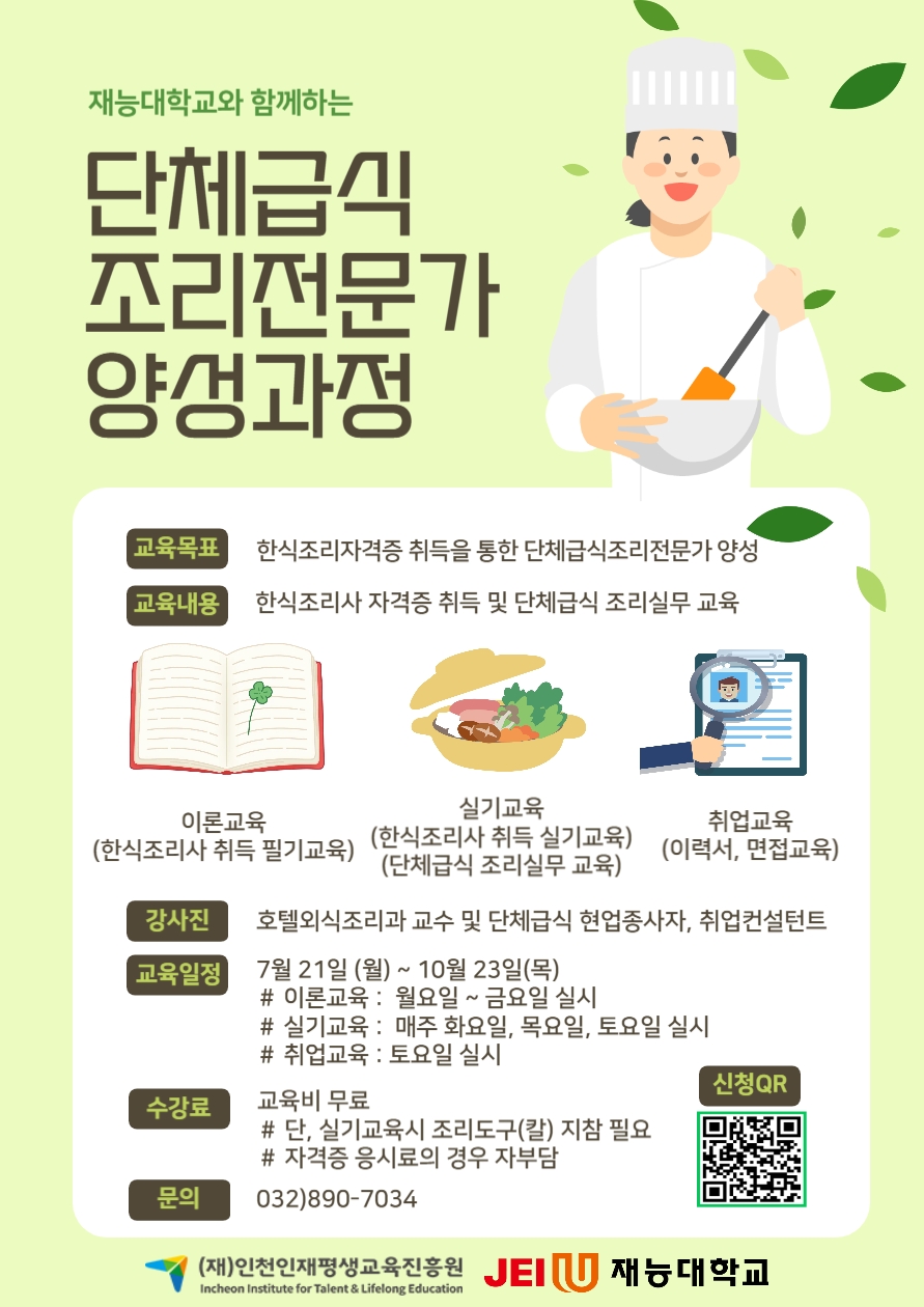 - 단체급식조리전문가(한식조리기능사) 양성과정 ☞ 032-890-7034 / 재능대학교 평생교육원
