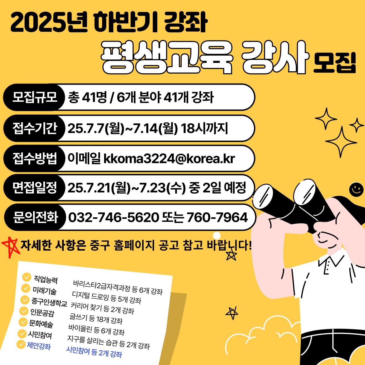 2025년도 하반기 중구 평생학습관정규 강좌 강사를 붙임과 같이 공개 모집하오니 역량있는 강사들의 많은 지원과 참여 바랍니다.