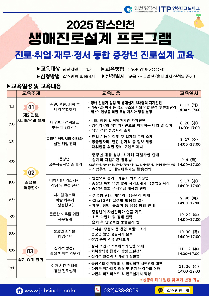 잡스인천은 중장년 진로·취업·재무·정서 통합 지원을 위한「2025 생애진로설계 프로그램」을 개설하고 교육생을 모집하고 있습니다.